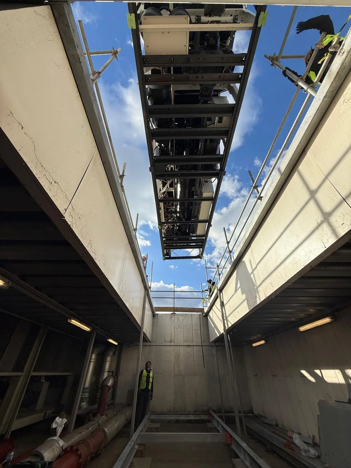 Fortunately the new chillers were 20mm narrower once the lifting eyes were removed and with a quick field modification to the rigging arrangements the chiller was lowered in scratch free.